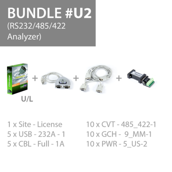The 232Analyzer Bundle #U2 (Unlimited-Site-License Bundle 2) allows users to perform RS-232 / RS-485 / RS-422 monitoring and simulation tasks. It allows users to monitor full-duplex RS-232, half-duplex RS-485, and full-duplex RS-422 / 485 communications with direction indication and timestamps.