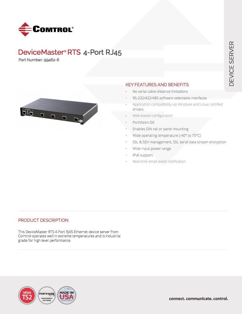 99457-2 DeviceMaster RTS 8-Port RJ45 This DeviceMaster RTS 8-Port RJ45 Ethernet device server from Comtrol operates well in extreme temperatures and is industrial grade for high level performance