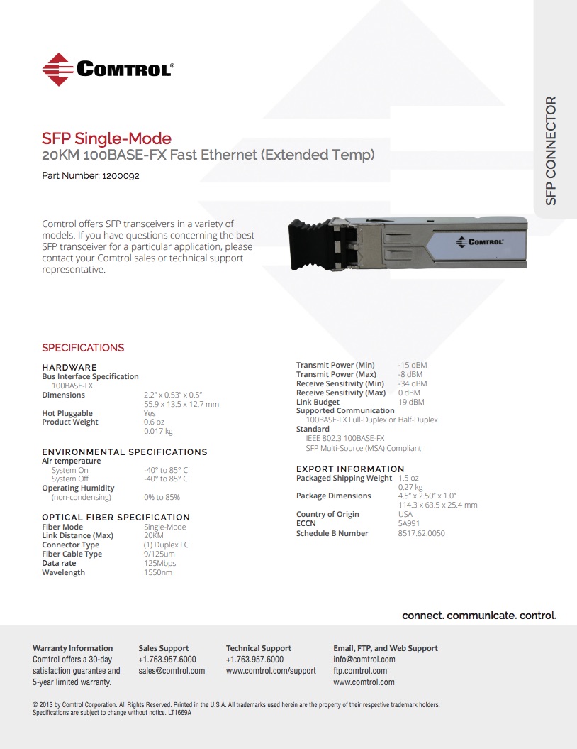 1200092 SFP, Single-Mode, 100 BASE-FX Fast Ethernet (Extended Temperature
