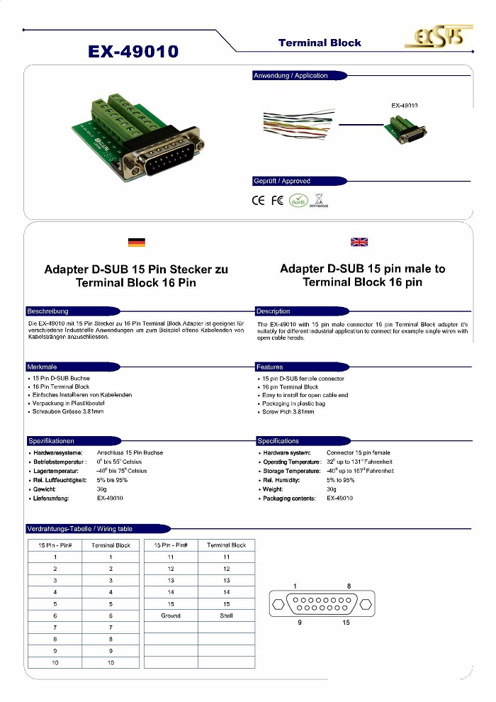 Adapter D-SUB 15 pin male to Terminal Block 16 pin