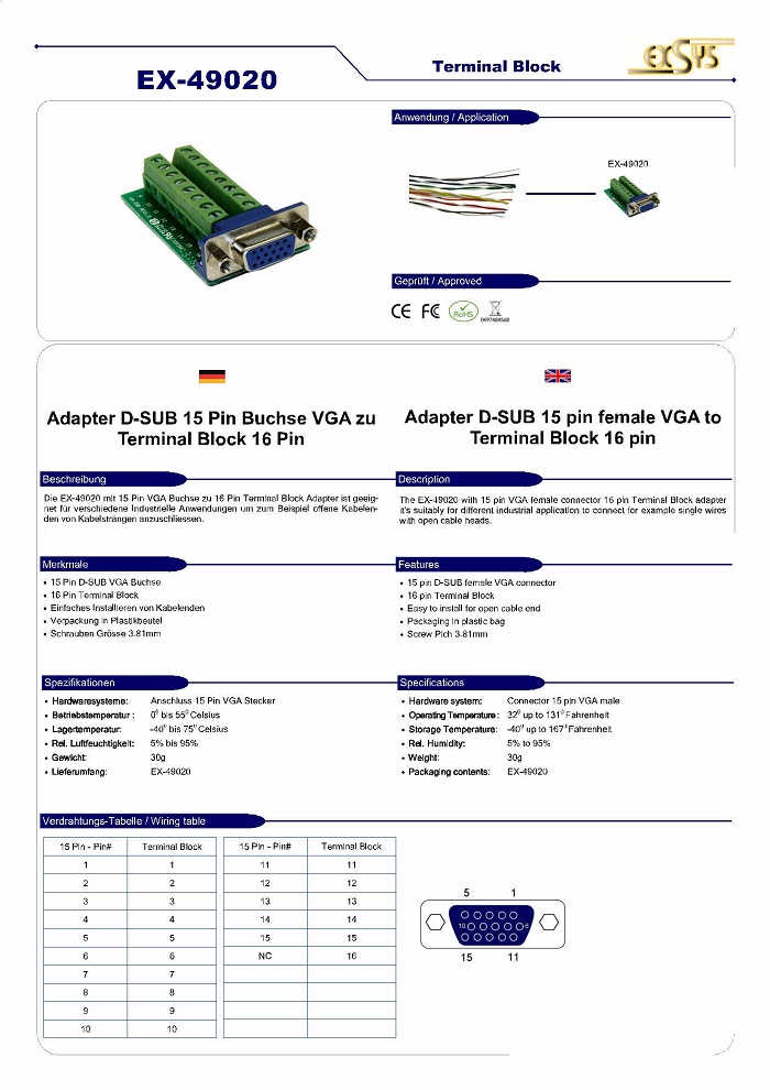 Adapter D-SUB 15 pin female VGA to Terminal Block 16 pin