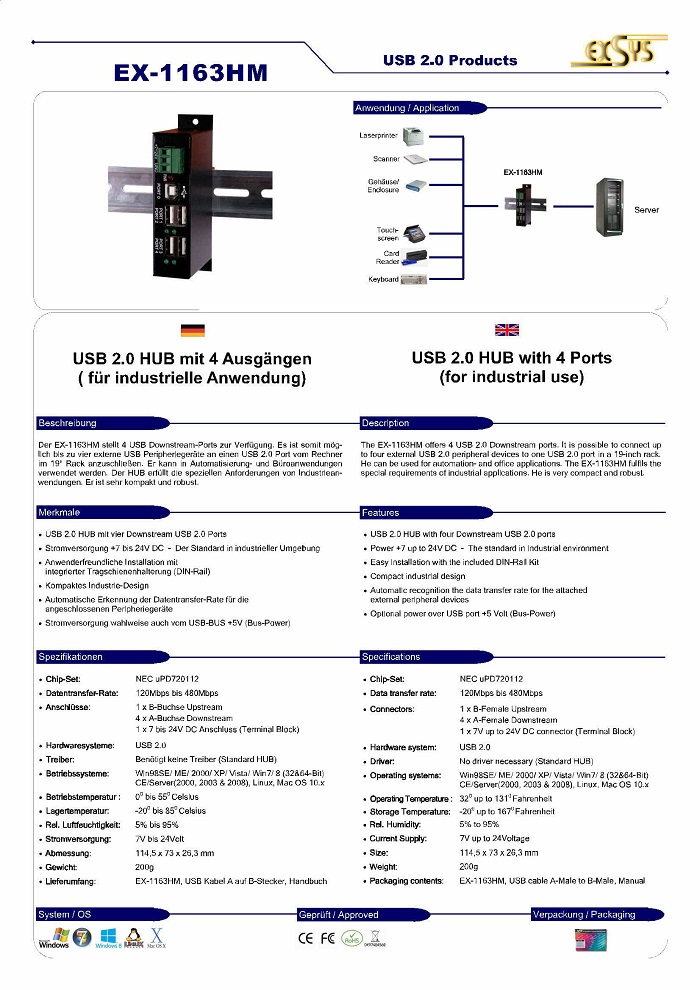 USB 2.0 HUB with 4 Ports (for industrial use)