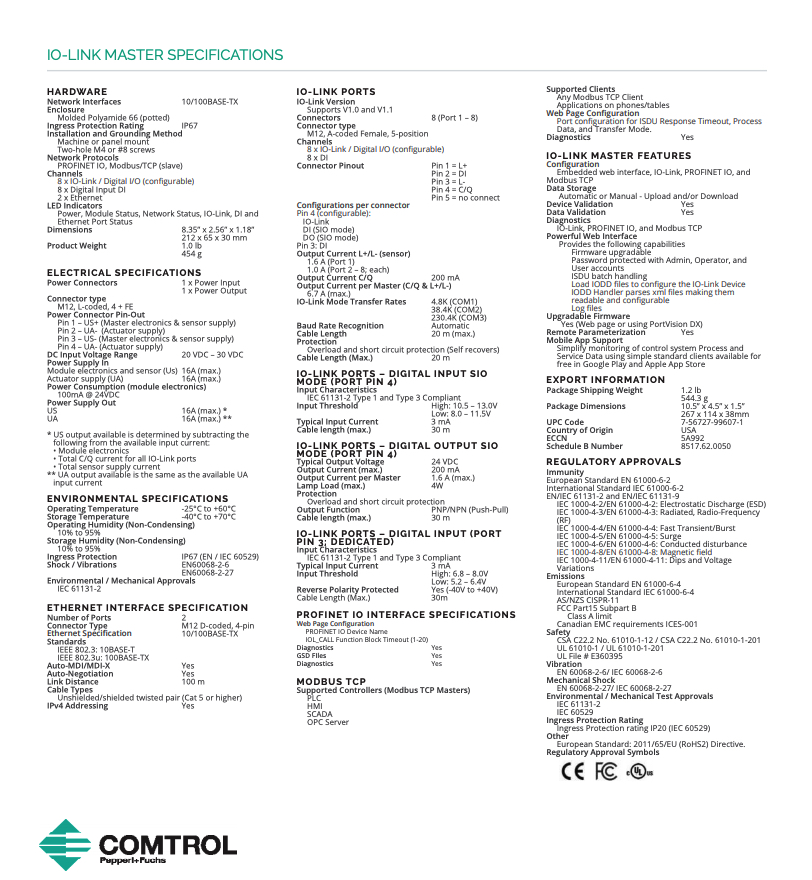99607-1 IO-Link Master 8-PNIO, (IP67) Comtrol IO-Link Master 8-PNIO-L (8 port IO-Link Master to PROFINET IO) [allows up to eight sensor or actuator connections on a single master] w/ (8) IO-Link M12, (2) M12 10/100BTX & (2) M12 Power, L-coded (input/output)