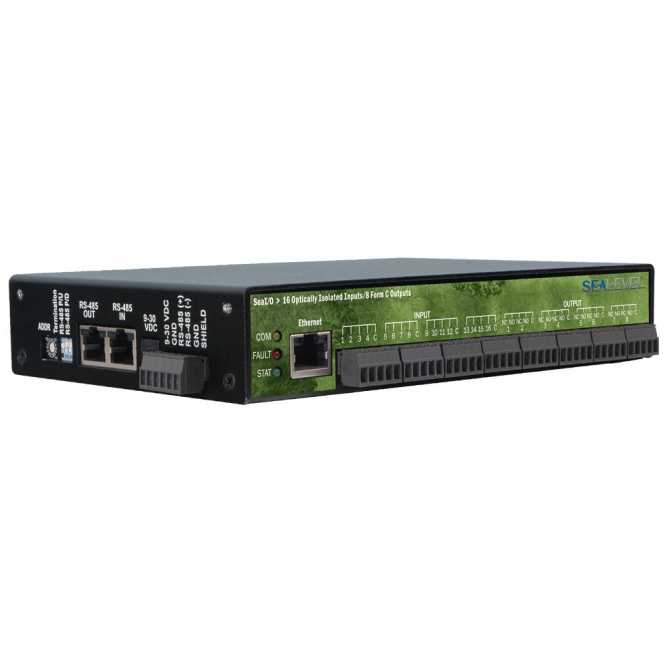 Interface 16 optically isolated inputs and 8 Form C relay outputs via any 10/100BaseT Ethernet connection with the SeaI/O-420E. Inputs can range from 5-30VDC while the Form C relay outputs can switch up to 60VDC @ 2A. The SeaI/O-420E is powered from your 9-30VDC source, or select from a variety of Sealevel power supply options.